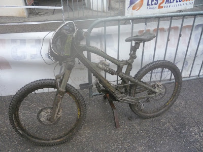 Down past Le Diable lift station, and onto rutted grassy singletrack – again all new since last year – now the ruts and braking bumps really seemed to take their toll here – on the way down to the super steep “double black” – dropping in, my arms are killing – probably 15 minutes into the race now – so struggling to exert enough force to brake, and with bodies strewn left, bodies strewn right, I am sent slightly off line and crash into a bend. Hot damn – people pass me. Brush down and off again, and literally off again as I wash out into a flat corner – not enough brake! Ouch my arms. Have a little dirt nap – check my makeup – what am I having for tea? Pull pads up – oh best get going again – people are passing again. Gasp. Negotiate the tricky corner before the shale descent with aplomb – back on it – think of having a rest before dropping in to this carve-able descent, keep yourself on track with little shale berms – no rest – no time! Drop in, carve past bodies, to slightly muddy stream crossing – again front wheel washout – getting used to this, 3rd off in as many minutes – splash! Arm into only wet part of course! Yowsers! No time for a dirt nap this time, crack on past more fallen comrades. Across a meadow – no time to admire the flowers – and drop into the bike park, down the 4x track. Not really enough energy for the jumps, but have a go anyway (“Gav is sure to have done the road gap” goes through my mind – he did BTW) – then a nice pedal along the yellow dirt road past the swimming lake – then a little climb upto the start of the descent to Mont-de-Lans. I had a chain off moment here last year, the chain went over the biggest gear at the back and got trapped behind the cassette and the spokes. Those who don’t remember the past are doomed to repeat it – so I drop to granny ring, scalps in sight pushing up this bit – and the chain comes off – literally the same place as last year! Gutted, but inevitable. Bike upside down, chain back on, push up and drop in. On someones tail here down the switchbacks, they finally succumb, someone crashes in front of me and I ride past as they hold their crown jewels. I take one final scalp going past the lift station, then to cries of “go das” I try and jump the side of a berm into the finish – fail miserably and wobble across the finish line. Position – 231st out of 400 in 30:03. Winning time was around 19mins. That seemed so much meaner than last years qualifier. It was hard work for a full 30minutes. I am in row 14 out of 19 for the main race. I was in row 11 last year, but I can't remember how many rows there were (I should read my own blog)